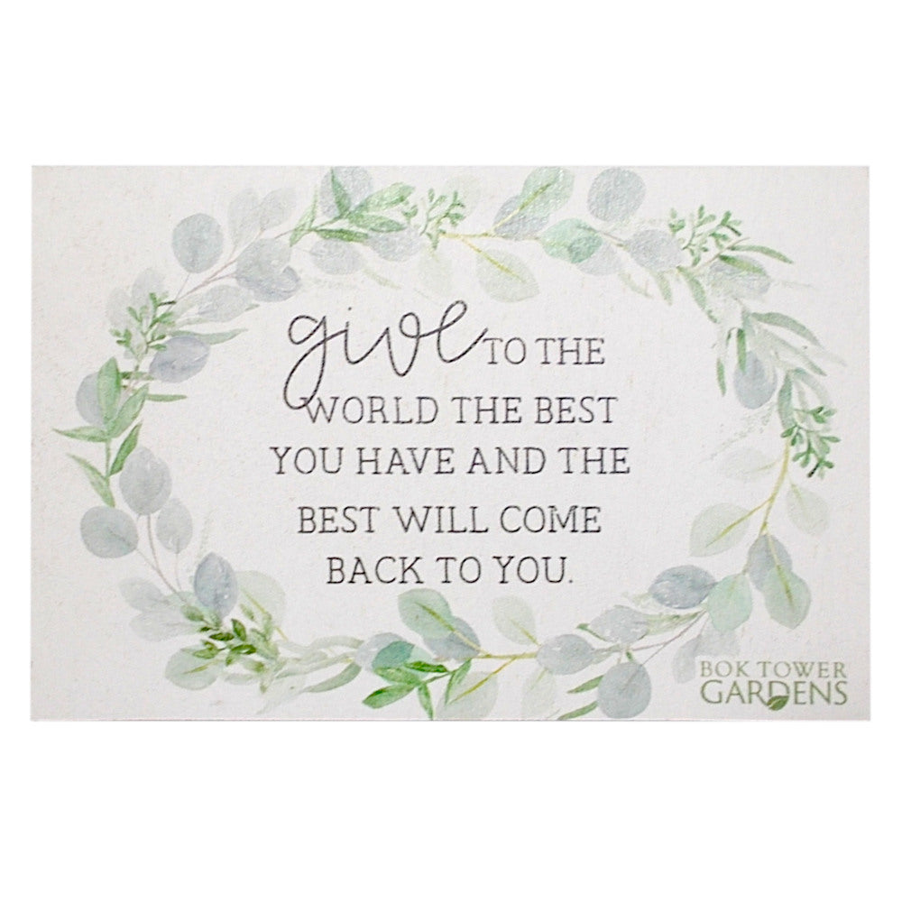 This 4" X 6" postcard is made in the USA from sustainable birch with a beautiful wood grain finish.  It features the inspirational quote "Give to the world the best you have and the best will come back to you." by American poet Madeline Bridges. It can be either mailed, or you can keep it as a decorative keepsake.