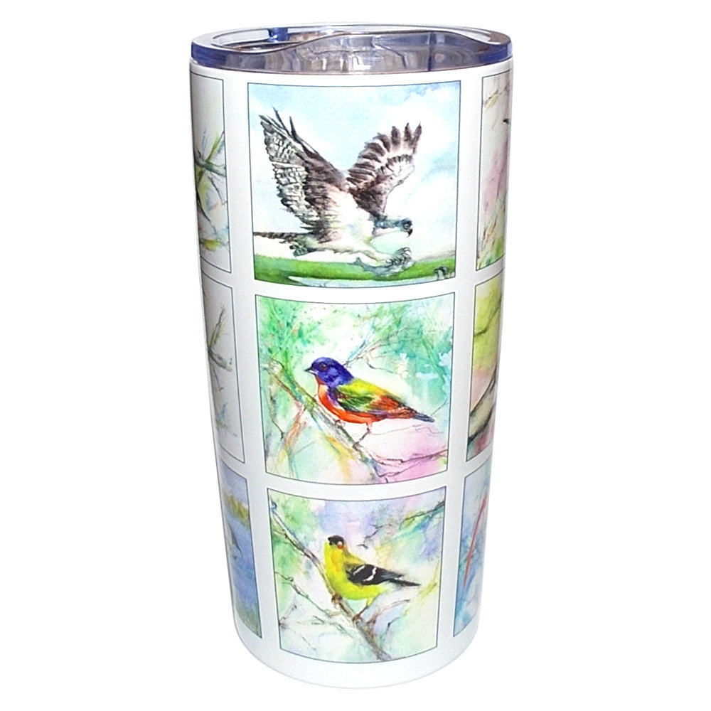 Keep your beverages hot or cold for hours with this beautiful 20-oz stainless steel tumbler that is adorned with reproductions of watercolor artwork by award winning artist Shirley Bell. The wrap-around design showcases the following birds that are frequently seen at Bok Tower Gardens: